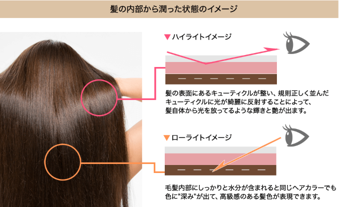 髪表面のキューティクルが整い光が反射するツヤが出ている状態と、
