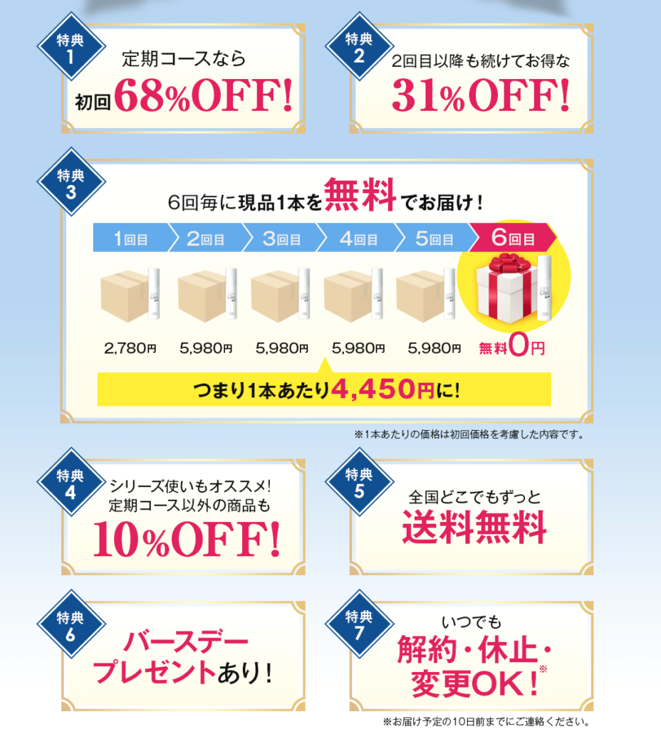 愛用者50,000人突破記念キャンペーンで、定期お届け特別価格として下記の7大特典がゲット出来ちゃいます!